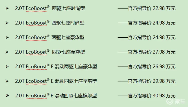 新款延续了福特锐界L特有的2-2-3座椅布局和二排头等舱级空间体验,让全家出游更舒适;大马力E混动系统兼顾了强动力、低油耗和长续航优势,蝉联2023~2024年“中国心”十佳发动机及混动系统奖项;加上全车超50%高强度钢和同级独有的540°透明座舱,成为真正的“全家安心出游神器”。
