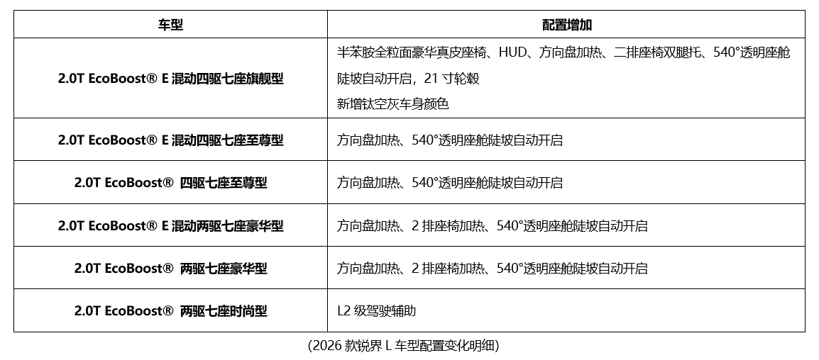 本次2026款锐界L的四大升级,每一项都贴合了用户更实用的需求,带来了更优质的全家出游体验,让2026款锐界L的产品力得到进一步提升。